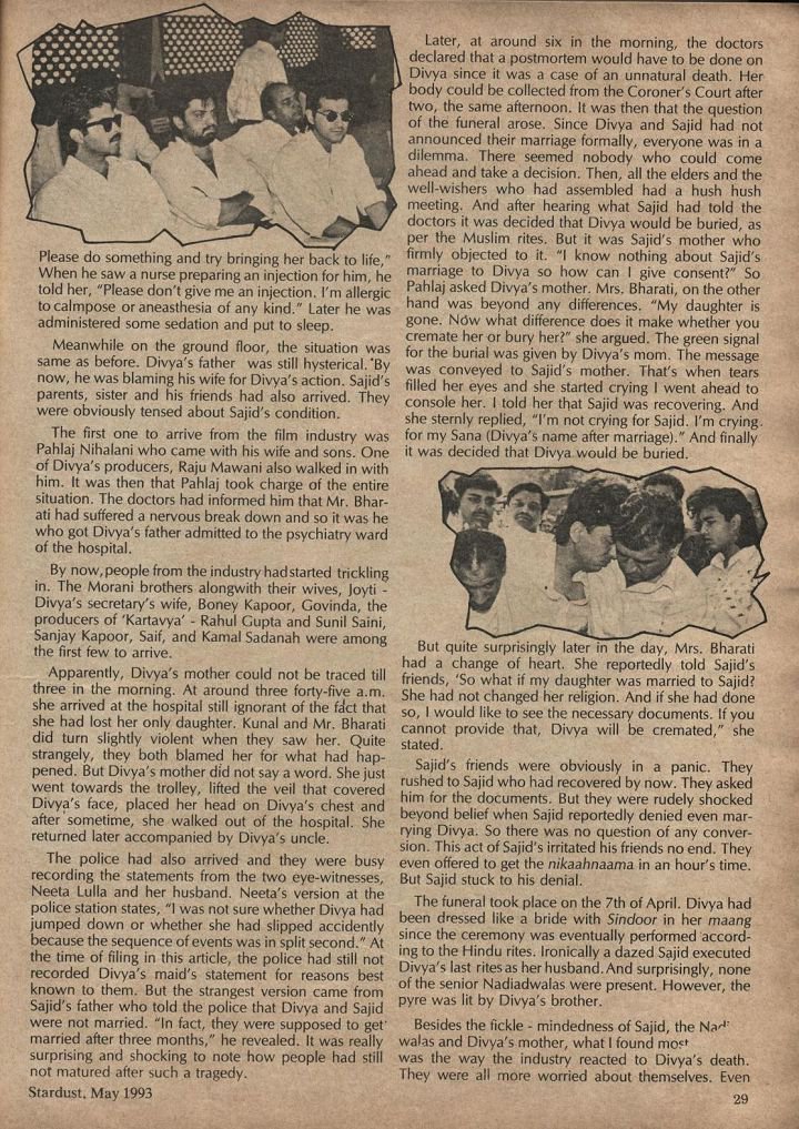 tergagap dekat line yang sama macam Divya. Raveena Tandon kata SriDevi kena kacau dengan roh Divya masa shooting movie Laadla sampai pengarah terpaksa panggil tok sami baca mantra supaya tak kena kacau. Lepas pecahkan kelapa di tempat shooting baru diorang boleh berlakon balik macam Om suruh Mukesh pecahkan kelapa dekat set dalam Om Shanti Om tu.